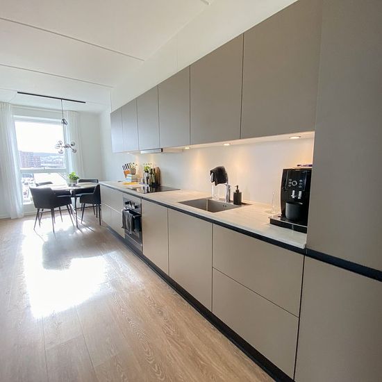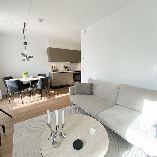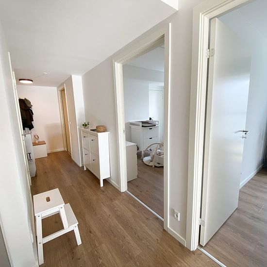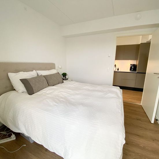 Welcome to this fantastic 3-room apartment located in a new development close to Aalborg city center, on the sought-after Dag Hammarskjöldsgade. This inviting apartment is located on the 4th floor and welcomes you through a spacious entrance hall that immediately leads you into a well-designed hallway. Along the way, you encounter the modern bathroom, which impresses with its spaciousness and stylish design elements. Further down the hallway, you find two cozy bedrooms on the right-hand side, both offering comfortable living spaces with pl...