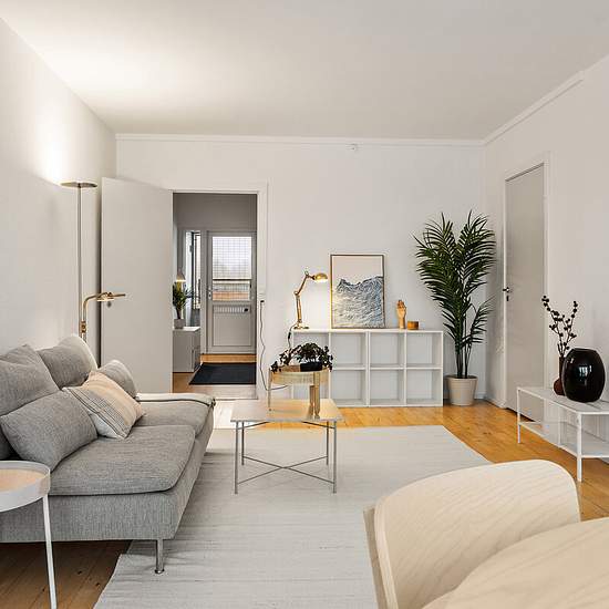 Et hjem med udsigt, lys og hverdagens bekvemmeligheder. Lejligheden byder på en lys stue og et rummeligt soveværelse, der tilsammen skaber en behagelig ramme om hverdagen. Køkkenet er lyst og enkelt indrettet med god skabsplads og et roligt, sammenhængende udtryk. De hvide fronter giver rummet en lethed, der gør det nemt at indrette efter egen stil. Planløsningen åbner naturligt mod resten af boligen, så køkkenet bliver en integreret del af hjemmets daglige flow – et funktionelt og indbydende rum, hvor der er plads til både madlavning, hverd...