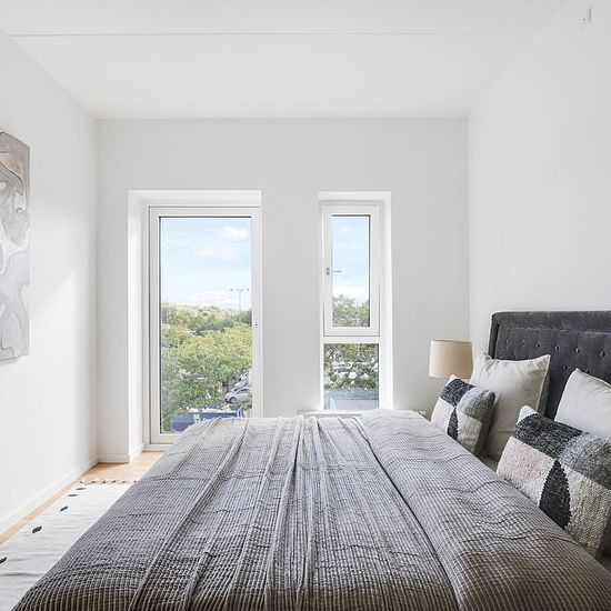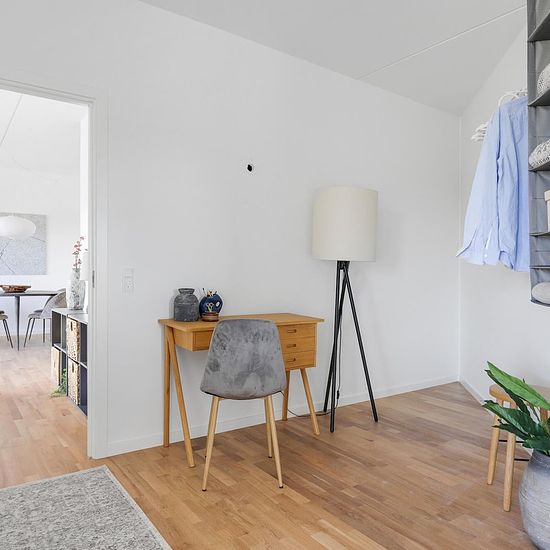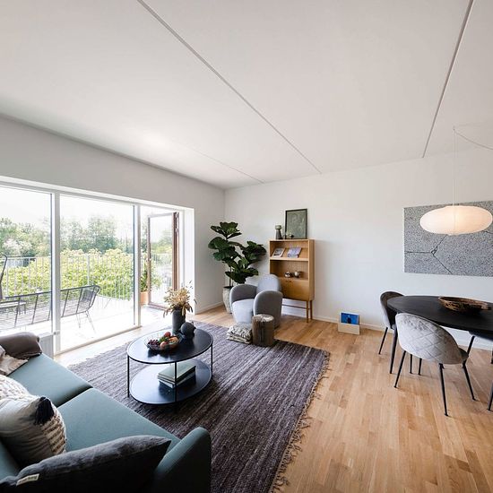 The apartment is modern and brightly furnished with beautiful natural light from the large windows. All apartments have direct access to their own terrace or balcony, so you can also enjoy life outside simply by opening the terrace door, and you are likewise guaranteed a beautiful view over Albertslund. The building has been developed with a focus on creating a unique senior community. Therefore, as a resident, you have access to shared facilities such as a rooftop terrace with a jogging path and seating areas, a quiet courtyard with an ora...