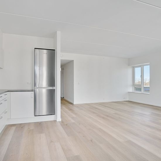 Bright and lovely 3-room apartment, constructed with the most quality-conscious materials, naturally with underfloor heating, wood plank vinyl flooring, fittings from Invita, and generally maintenance-free rental unit. Nice large entrance hall with built-in double wardrobes. From here access to bathroom with space for a washing column, built-in bathroom arrangement with maintenance-free stone countertop, glass shower partition, and beautiful tiled floor. The open kitchen with dining area features a beautiful stone countertop and built-in f...