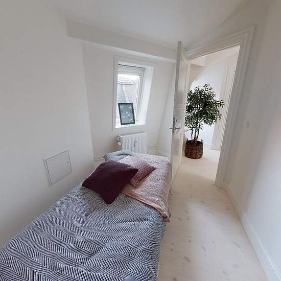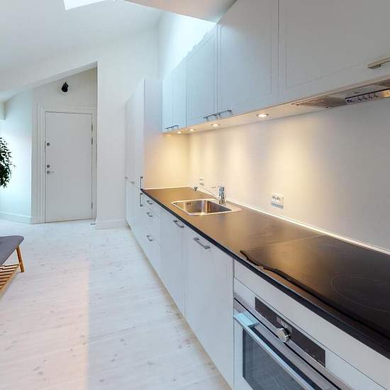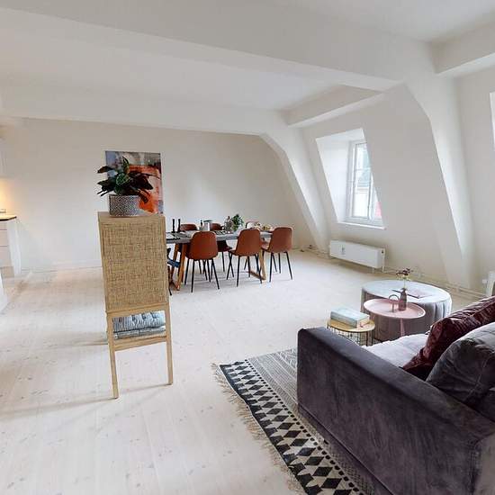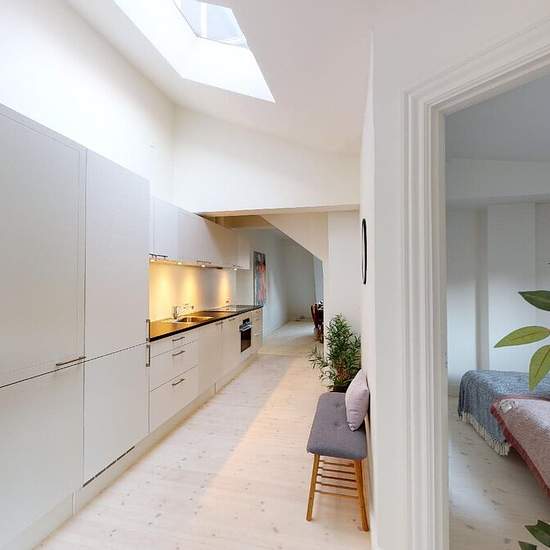 This renovated apartment combines quality materials with a sleek Nordic design that perfectly suits its central location in the heart of Copenhagen. Layout and details The home is well laid out with a separate kitchen and living room. In the living room, the beautiful white-pigmented wooden floors create a bright setting that makes it easy to arrange a cozy seating area. The kitchen, which adjoins the entrance hall, is finished in a modern black-and-white design and is fully equipped with all major appliances. The apartment is situated on ...