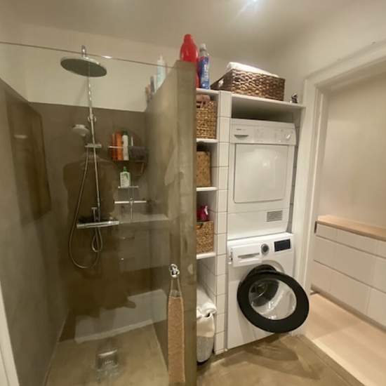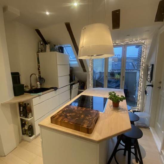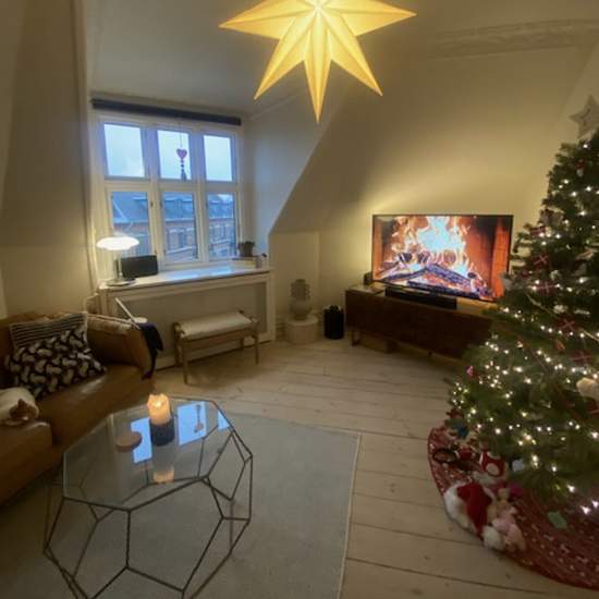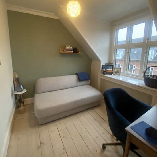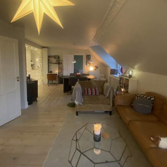 The apartment is located on the top floor of a typical classic Østerbro building by Melchiors Plads. You are close to everything here. There is no elevator. The apartment has a living room open to a balcony and kitchen, two bedrooms and a lovely bathroom with a stacked washer-dryer and a shower cabin. There is a storage room. The apartment is rented out for one year from March 1st to expats.