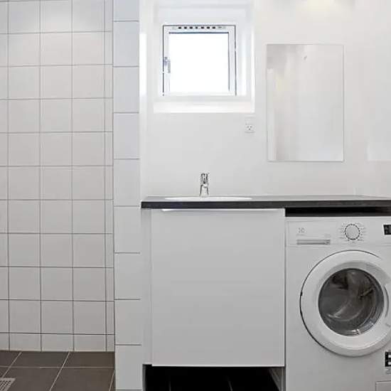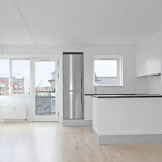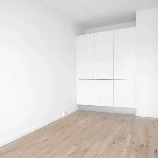 The apartment The apartment is finished in light, timeless materials, with plenty of natural light, solid parquet floors and white-painted walls, ceilings and panels. The spacious living room leads to a functional kitchen with good cupboard space, a stove, fridge and freezer, an extractor hood and a dishwasher. The bathroom offers a separate shower cubicle and a stacked washer-dryer unit. The bedroom has built-in closets for storage, and there is also an attached 3–4 sqm storage room in the basement. It is possible to apply for permission to...