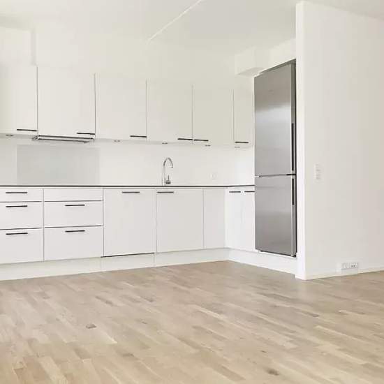 The apartment The apartment is designed in a Scandinavian style, which makes it appear modern, bright and inviting. The large windows let in plenty of daylight, creating a warm atmosphere and a beautiful play across the light oak floor. The heart of the apartment is a central living area with an open kitchen and dining space. The understated white kitchen is from Invita with major appliances from Siemens. The bathroom has tiles on the floor and in the shower enclosure. There is also a washing machine and tumble dryer from Siemens. The master...