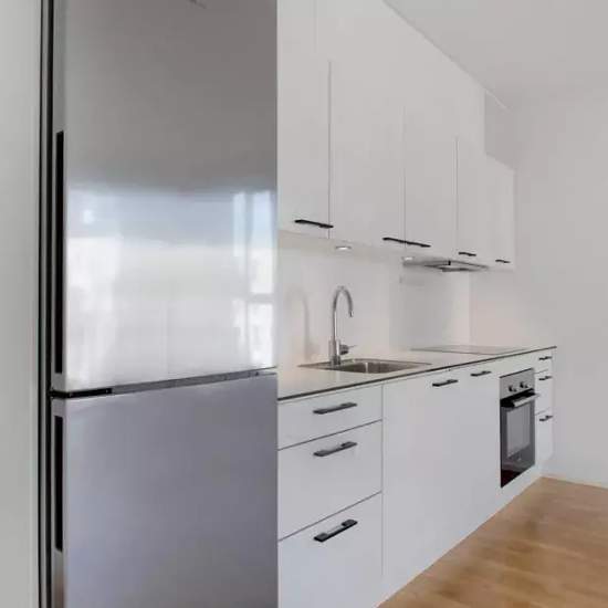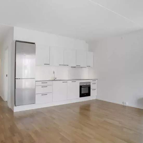 Lejligheden Lejligheden er opført i skandinavisk stil, der får den til at fremstå moderne, lys og indbydende. De store vinduer lukker store mængder dagslys ind og skaber derved en varm atmosfære og et flot spil på det lyse egetræsgulv. Lejlighedens hjerte er et centralt opholdsrum med åbent køkken og spiseplads. Det diskrete, hvide køkken er fra Invita med hårde hvidevarer fra Siemens. På badeværelset er der fliser på gulvet og i brusekabinen. Der er desuden vaskemaskine og tørretumbler fra Siemens. I mastersoveværelset findes indbyggede ska...