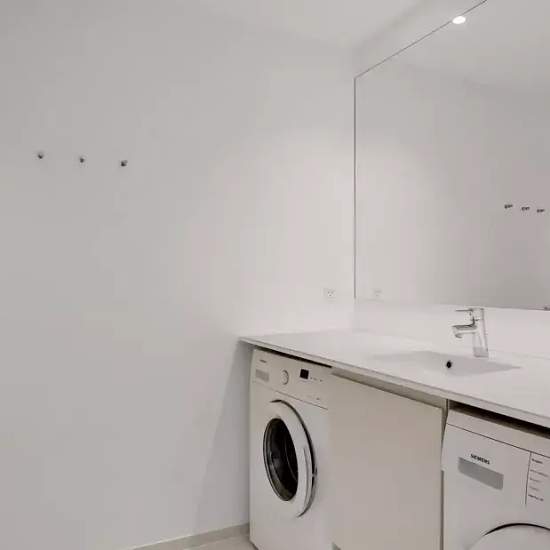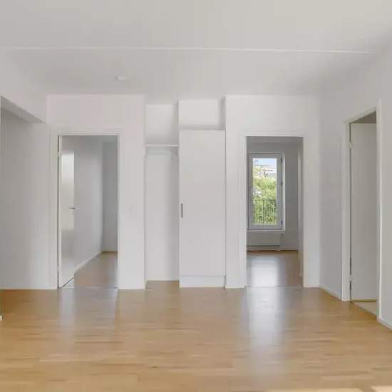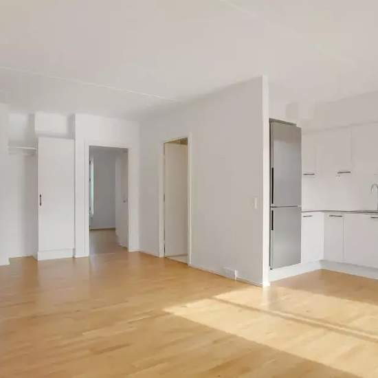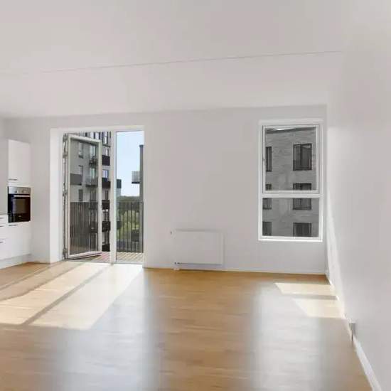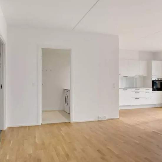 The apartment The apartment is built in a Scandinavian style, which makes it appear modern, bright and inviting. The large windows let in generous amounts of daylight, creating a warm atmosphere and a beautiful play on the light oak floor. The heart of the apartment is a central living area with an open kitchen and dining space. The discreet, white kitchen is from Invita with appliances from Siemens. The bathroom has tiles on the floor and in the shower cubicle. There is also a washer and dryer from Siemens. The master bedroom has built-in c...