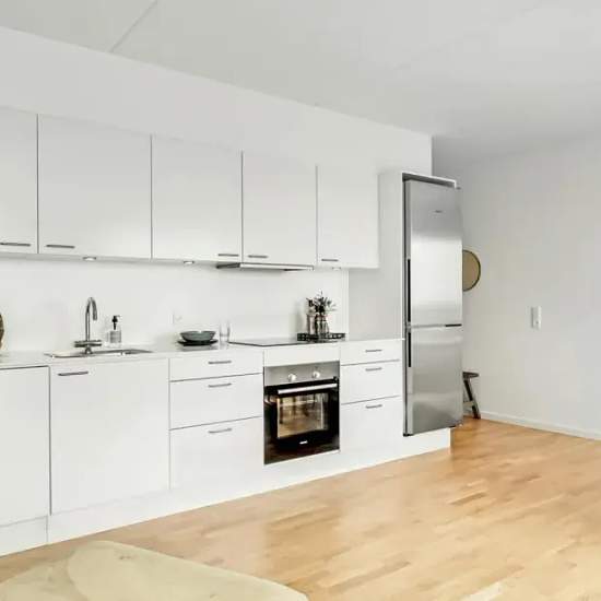 Lejligheden Lejlighedens hjerte er et centralt opholdsrum med åbent køkken, spiseplads og opholdsstue. Lejligheden er opført i klassiske, tidssvarende materialer og har store vinduer, hvilket giver et fantastisk lysindfald. Køkkenet, som er fra Invita, fremstår lyst og med indbyggede, hårde hvidevarer fra Siemens. Badeværelset er praktisk med gulvvarme, indbyggede spots, separat bruseniche samt vaskesøjle. I soveværelset er der installeret skabe med plads til opbevaring. Det er muligt at ansøge om husdyrtilladelse i alle vores lejemål. OBS: ...