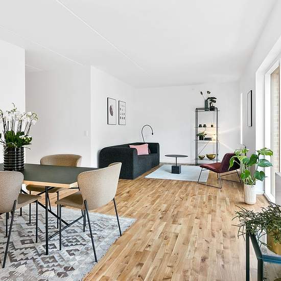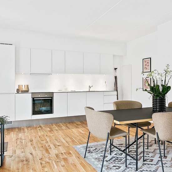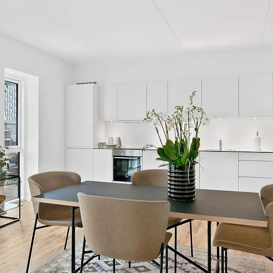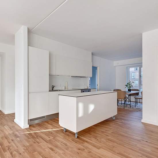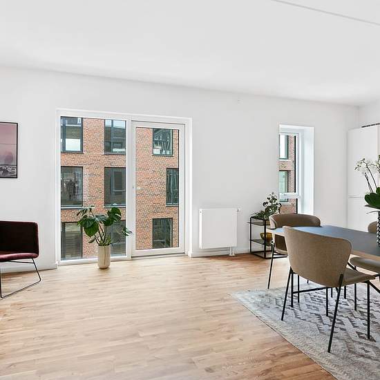 Landlord: DEAS Broker Mail: EMAIL no.: Welcome to Organistens Hus! The residences range from 2 to 6 rooms and are designed with spacious living areas and good bedrooms. The minimal hallway areas provide optimal use of the square metres, with the living room and kitchen combined into one large, natural living space. Here, light wooden floors and an elegant, white, timeless kitchen create an inviting setting for everyday life. Brick recesses and nuanced grout colours in the red brick on the building’s lower section create a lively and characte...