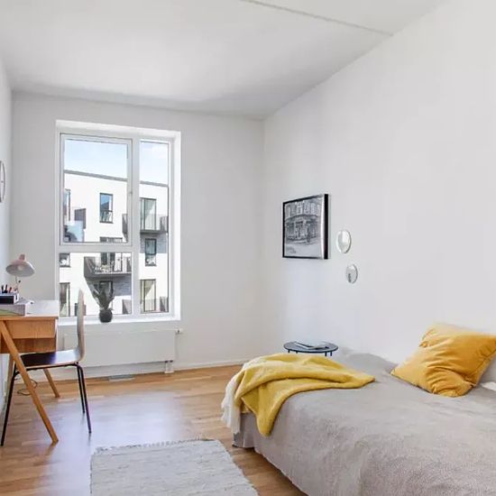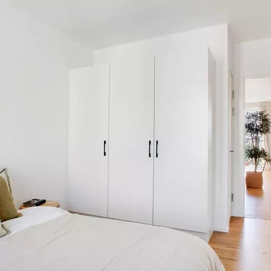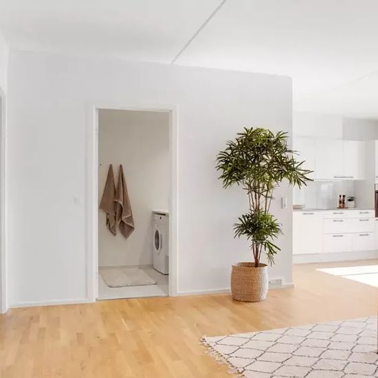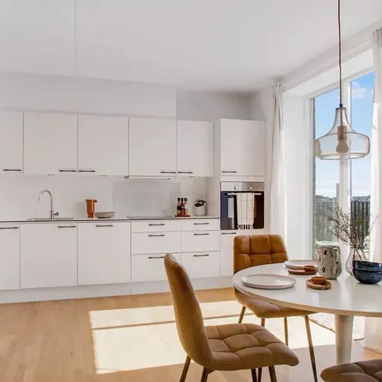 The Apartment The apartment is built in Scandinavian style, giving it a modern, bright, and inviting appearance. The large windows let in plenty of daylight, creating a warm atmosphere and a beautiful effect on the light oak floor. The heart of the apartment is a central living space with an open kitchen and dining area. The discreet, white kitchen is from Invita with appliances from Siemens. The bathroom features tiles on the floor and in the shower cabin. There is also a washing machine and dryer from Siemens. The master bedroom has built...