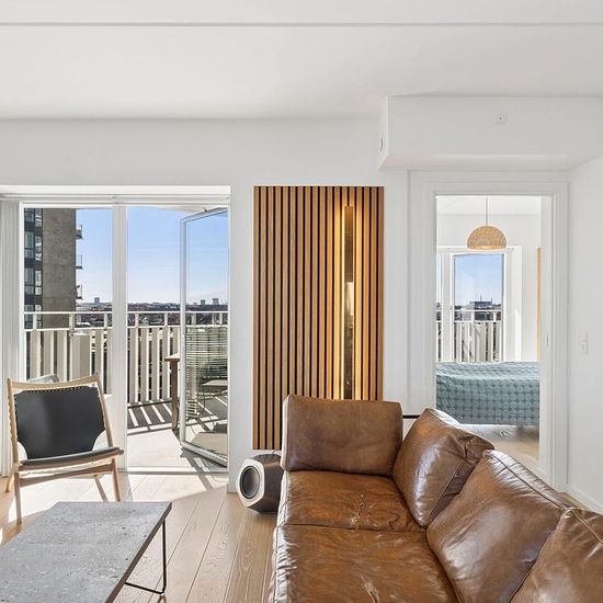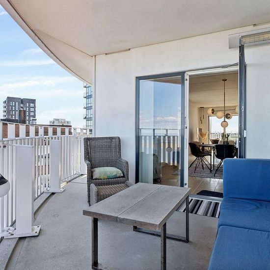 Exclusive 3-room apartment with panoramic views of the Øresund – 122 m² on the 8th floor in Twister At Amager Strandvej 110B, this refined 3-room apartment of 122 m² is now available, located on the 8th floor in the iconic building Twister – with a unique view over the Øresund. The heart of the home is the large, open kitchen-dining and living area combined, where light, air, and view come together in perfect harmony. The large window sections and direct access to the wide, curved balcony create a special calm and sense of space – perfect ...