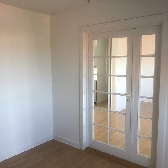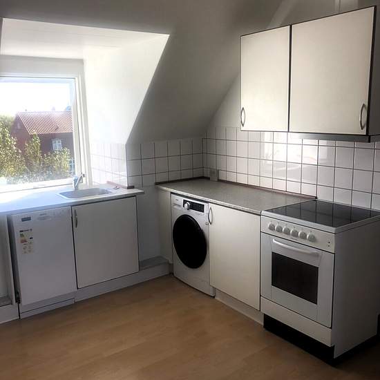 Newly renovated three-room apartment. The rental includes an entrance hall and a white Kvik kitchen with all appliances, including a refrigerator-freezer, stove and dishwasher. The kitchen is open to the living room. In addition there is one bedroom, an extra room and a bathroom. Private washer-dryer. A small pet may be permitted, but only with written permission from the landlord. The floor plan is indicative only.