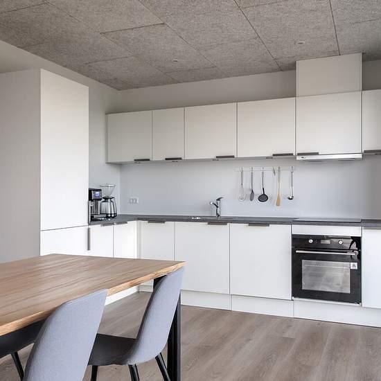 Welcome to Apartment Type E 79 m² – Functional home – Only on the 1st floor – Only one left. When you step into this home you are welcomed by an inviting entrance hall. To the right you will find a practical coat rail and two cupboards. Straight ahead is the first room with two cupboards, 9 m². Next comes the apartment’s bedroom of 10 m² with three cupboards. On the opposite side is the apartment’s bathroom. The bathroom is elegantly fitted with a cabinet arrangement and a sink in artificial marble as well as an illuminated mirror (Svane). ...