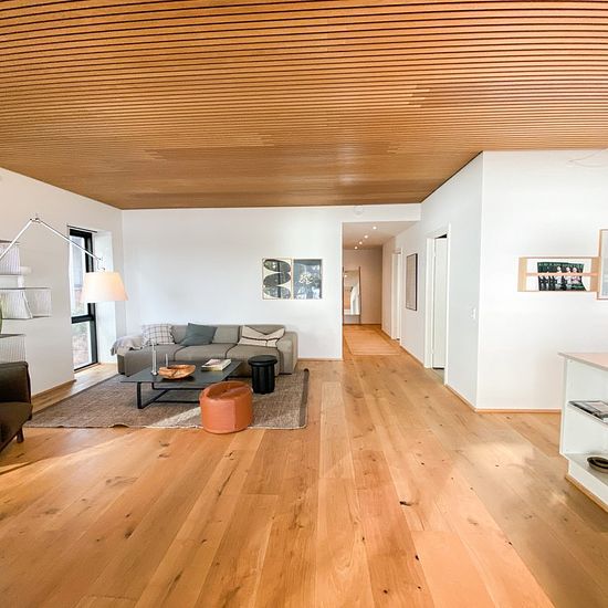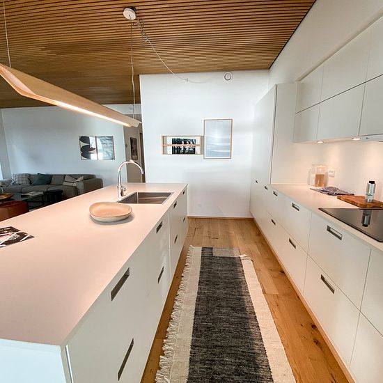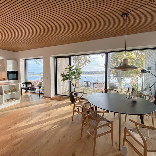The forest garden consists of 26 homes, each carefully designed by Kjær and Richter from Aarhus, where Nordic minimalism creates calm and elegance. Large window sections provide a sublime influx of light and an extended view over the rolling landscape and the fjord. Inside, you will find details such as manor-style plank floors and oak ceilings that elegantly connect the home's interior with the forest's nature. The kitchen from Svane, with white elements, invites cooking and togetherness, while the dining table frames conversations against...
