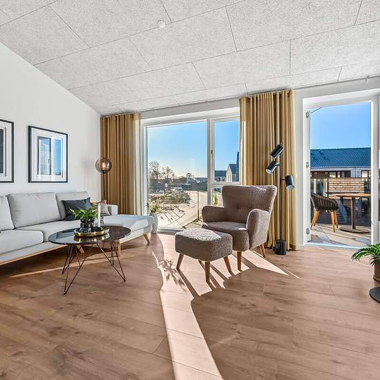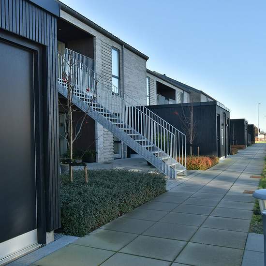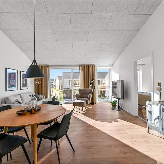 Brand-newly built — beautiful and bright apartment in Lind Note: The photos are from a comparable apartment — however located on the 1st floor. The floor plan and choice of materials are identical on the ground floor, although there are no Troldtekt ceilings. Contemporary and really nice apartment located centrally in Lind — close to shopping etc., and within a short bike ride to Herning. The apartment is arranged with an entrance hall, a bathroom with space for a washing machine and tumble dryer, an open-plan kitchen and living room, and 2...