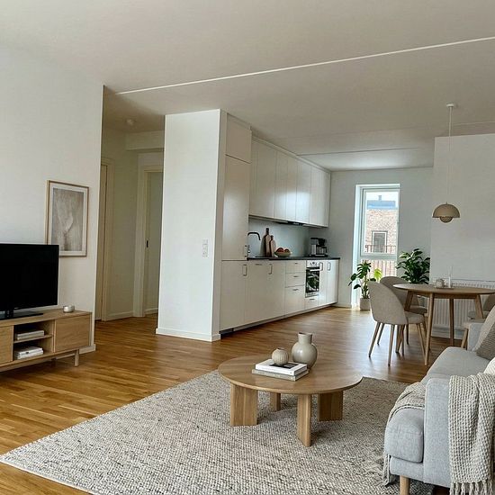 The open floor plan in the kitchen-living room makes it easy to fit both a dining table, sofa area, and a work nook – and the light coming in from both sides emphasizes the feeling of spaciousness. From your terrace, which faces southwest, you can enjoy the evening sun. The apartment has two rooms – one with built-in wardrobes and another perfect as a children's room or office. The spacious bathroom includes a stacked washer and dryer. Everything in the apartment is kept in classic tones, making it easy to put your own stamp on it. The buil...