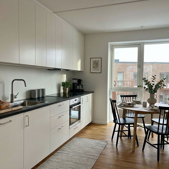 Den åbne planløsning i køkken-alrummet gør det let at få plads til både spisebord, sofaafdeling og en arbejdskrog – og lysindfaldet fra begge sider understreger følelsen af rummelighed. Fra din altan, som vender mod sydvest, kan du nyde aftensolen. Lejligheden har to værelser - ét med indbyggede garderobeskabe og ét andet oplagt som børneværelse eller kontor. Det rummelige badeværelse er med vaskesøjle. Alt i lejligheden er holdt i klassiske nuancer, så den er let at sætte sit eget præg på. I ejendommen er der elevator, og boligen har medfø...