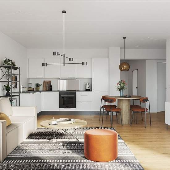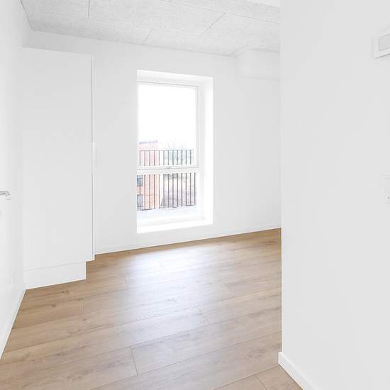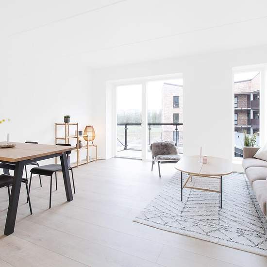Lys og rummelig treværelses lejlighed med stort køkken-alrum og stue, to værelser, bad og egen terrasse. Til boligen hører eget skur.