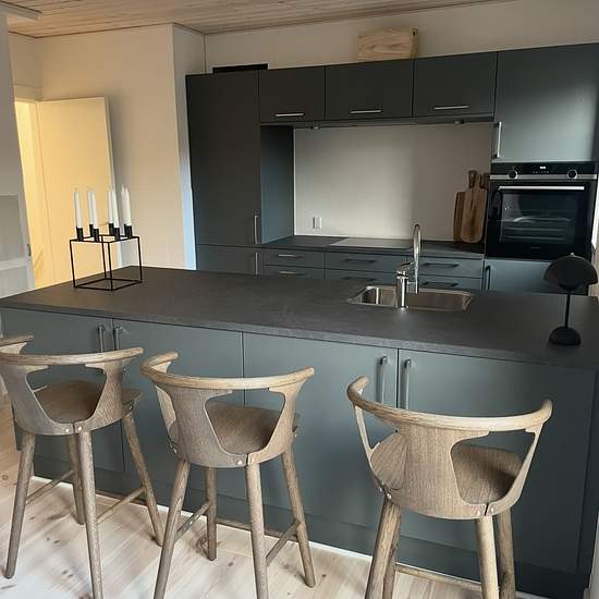 Unique and beautiful apartment in the heart of Horsens This beautiful two-level apartment offers a stylish, architect-designed kitchen with a kitchen island, giving the home an exclusive touch. The kitchen is fully equipped with a fridge/freezer, hob, extractor hood, a built-in oven at eye level and a dishwasher, as well as plenty of cupboard space. The kitchen is open to the living room, where there is ample opportunity to arrange both a seating area with a large sofa and a dining area. From the kitchen-dining area there is access to the a...