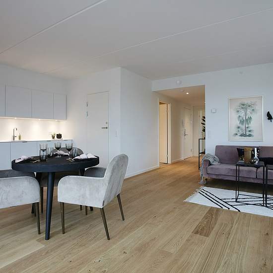 Eksklusiv lejlighed opført i de bedste materialer og beliggende i smukke omgivelser ved Bygholm Sø i Horsens.Brahesbakke består af 12 punkthuse med i alt 72 lejeboliger i den nye spirende bydel Bygholm Bakker.Med en lejlighed i Brahesbakke bliver du en del af det nye samt attraktive boligområde, hvor naturen er det centrale omdrejningspunkt. Lejlighedernes størrelser spænder fra 68 m2 – 101 m2, fordelt på 2, 3, og 4-værelses lejligheder.Denne rummelige 3-værelses lejlighed på 88 m² byder på et moderne og stilrent hjem med lyse trægulve og st...