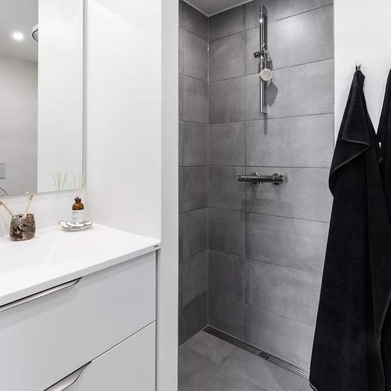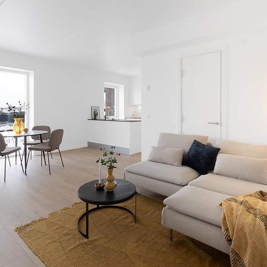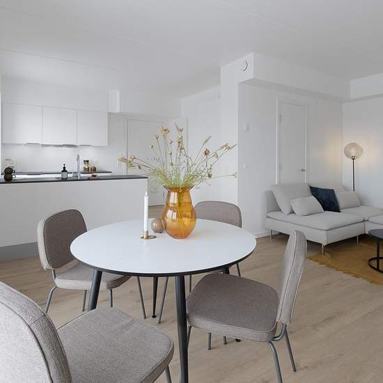 Well-laid-out three-room apartment with an open-plan kitchen/living area, two bedrooms, bathroom, entrance hall and its own balcony/terrace. The apartment includes a private shed.
