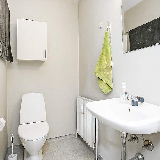 Nice and bright apartment on the first floor in a centrally located building in Hovedgård. The apartment is suitable for sharing and therefore appeals both to a couple of young people who want to live together but in separate rooms, a family with one or two small children, the single person who needs a hobby room, etc. The apartment is laid out with an entrance hall, toilet/bath, living room with space for both a sofa and a dining table, kitchen with a small dining area and two bedrooms. There is access to a communal garden, which is shared...