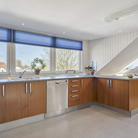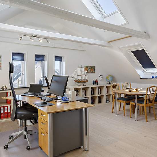 Beautiful 3-room top-floor apartment centrally in Kjellerup At the town square in Kjellerup you can now rent a very nice apartment on the 2nd floor, at the top of the building. The apartment consists of a large bright open-plan kitchen/dining area, a living room, two bedrooms and a bathroom. The living room has a vaulted ceiling and remote-controlled skylights. A heat pump is also installed. There is a spacious stairway/entrance from Østergade. From the back stairs there is access to a paved courtyard where there is space to park one car b...