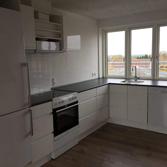 Torvet 4, 3rd floor, right-hand apartment, 8620 Kjellerup Lovely large fully renovated 3-room apartment located in the centre of Kjellerup. From the apartment's front door you enter a small vestibule. From here there is access to the apartment's large, bright kitchen/dining area. From the dining area there is access to a small balcony. The dining area also provides access to the apartment's two bedrooms and the bathroom. The kitchen, which is handleless white high-gloss, offers plenty of cupboard space and has a stove, dishwasher and fridge...