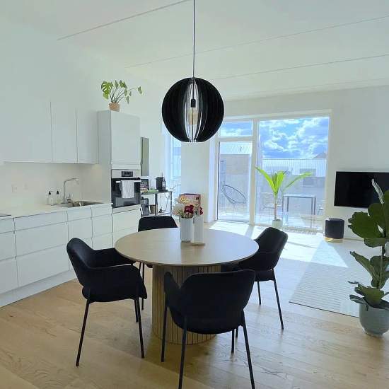 Når du træder ind i lejligheden, mødes du af det store og lyse køkken-alrum, hvor lyset strømmer ind gennem de store vinduespartier. Lejligheden er beliggende på øverste etage, så du får en fantastisk udsigt over Stigsparken, ejendommens hyggelige have, samt tagtoppene i horisonten. I køkkenet kan du glæde dig til at lave mad i det lækre grebsfrie HTH-køkken med Corian-bordplade og fuld AEG hvidevarepakke. Fra det store køkken-alrum har du udgang til den sydvendte altan, hvor du kan nyde de varme sommeraftener med grill og hyggelige stunder....