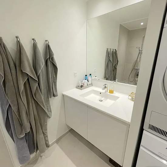 Welcome to this 3-room apartment where light and quality meet a modern location in Nørresundby. A move-in ready home with a pleasant atmosphere. The apartment offers a spacious entrance hall that leads you into the large, bright kitchen-living area, where sunlight streams in through the large windows. Here you can look forward to cooking in the stylish handleless HTH kitchen, equipped with an elegant Corian countertop and a full AEG appliance package. From the kitchen-living area you have direct access to the balcony, where you can enjoy wa...