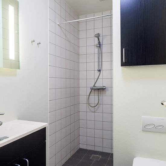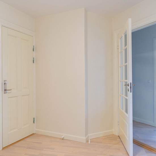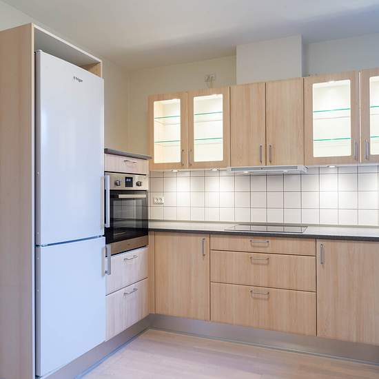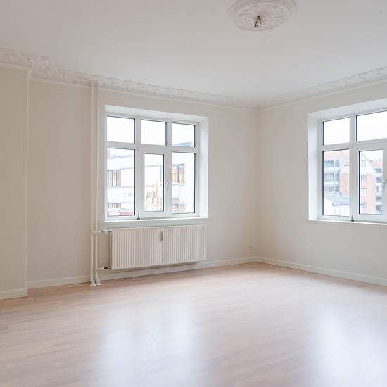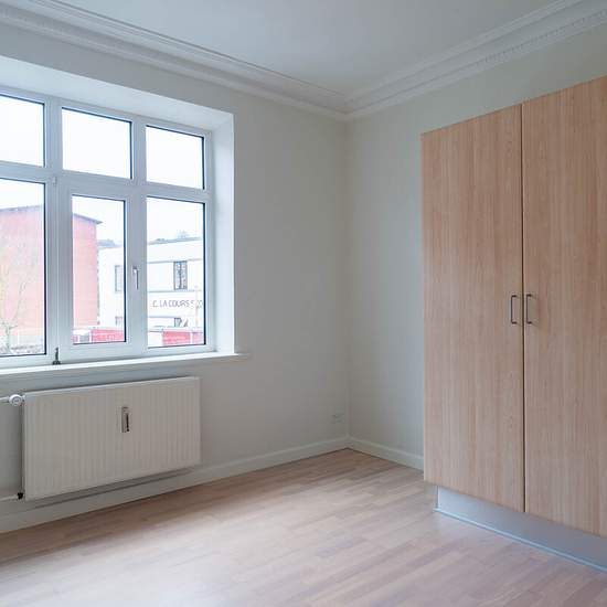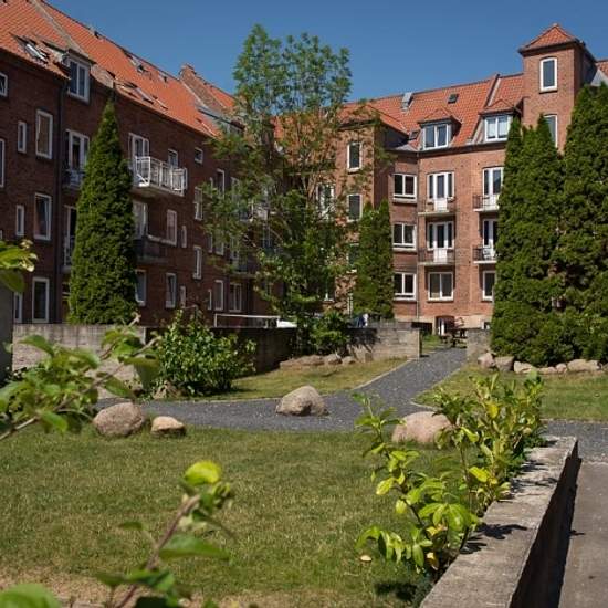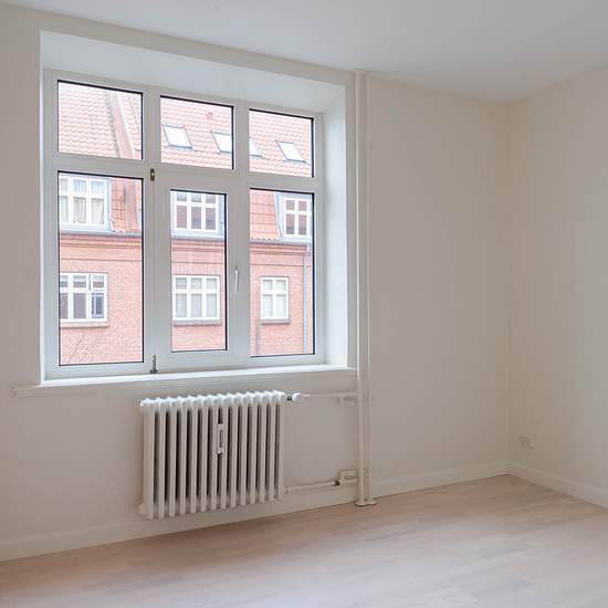 Modernized apartment, newer kitchen with newer appliances (stove, extractor hood, fridge/freezer, dishwasher), newer tiled bathroom with shower stall, newer floors throughout the apartment, newer interior doors and a new exterior door. Built-in wardrobes in the bedroom. Shared laundry and attractive communal courtyard. Rent includes water (normally DKK 400–500 per month). No pets allowed. The photo is not of the apartment in question but is essentially identical.
