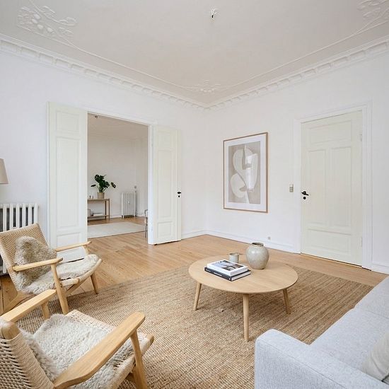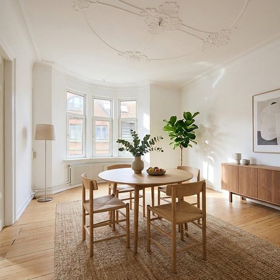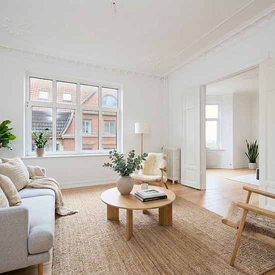 Welcome to this impressive 3-room mansion apartment in the heart of Randers, combining classic details with modern comfort. The apartment offers a fantastic view and features beautiful, original wooden floors, stucco, and double doors, giving the home a charming and timeless character. The rental consists of two living rooms as well as a suite, creating a spacious and functional floor plan that suits both relaxation and entertainment. Additionally, there is a recently renovated kitchen equipped with modern amenities, as well as a private was...