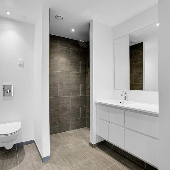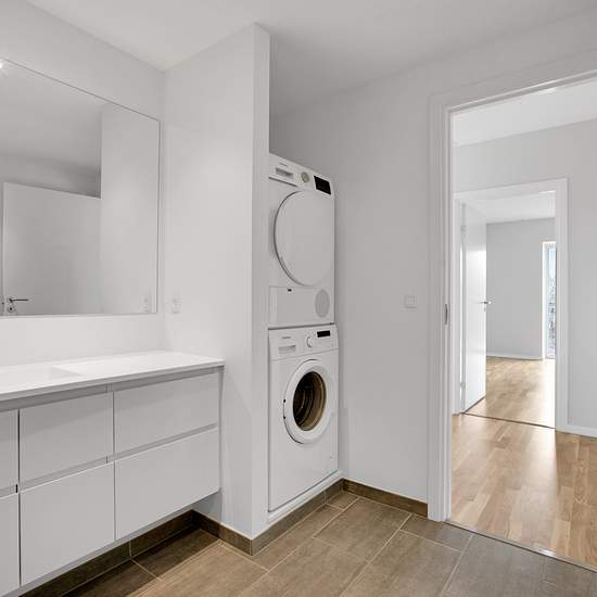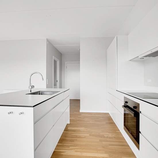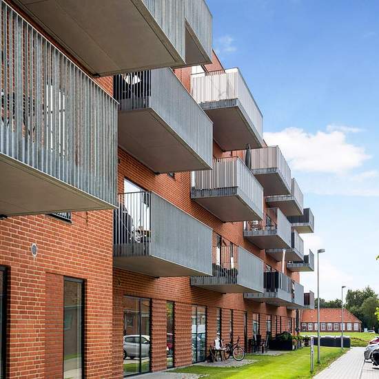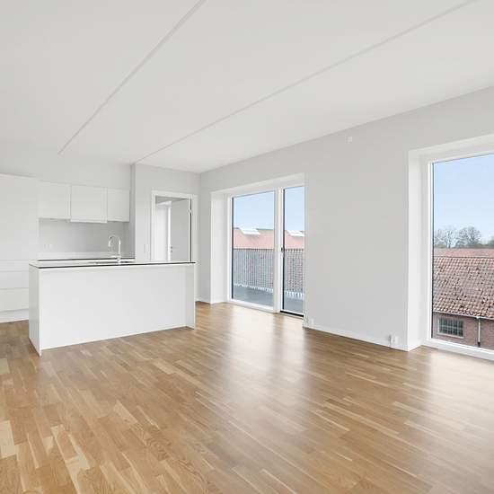 Velkommen til Randers Kaserne, hvor du kan bo i én af de 96 boliger, som fordeler sig på 2 til 4-værelses lejligheder på mellem 67 og 106 kvm. Alle lejligheder har eget depotrum i lejligheden samt egen altan eller terrasse, hvor du kan nyde solen. Det store, rummelige køkken er indrettet med køkken/alrum i åben forbindelse med stue, der danner rammen for fællesskab og liv. Køkkenelementerne er fra Svane og alt i hårde hvidevarer er fra Siemens.I badeværelset kan du nyde både gulvvarme, en rummelig bruseniche med Rain Shower bruser samt lejli...