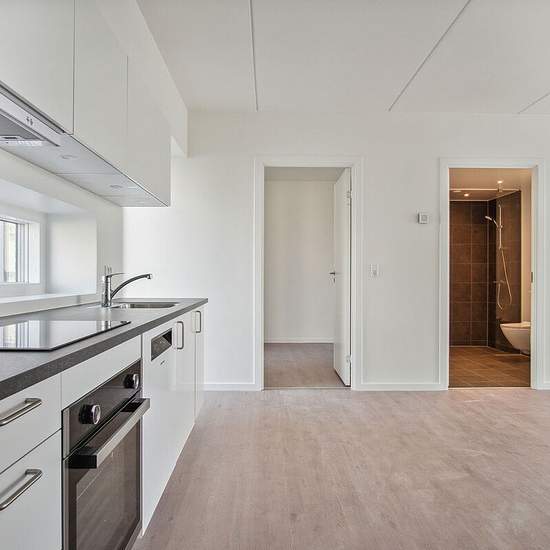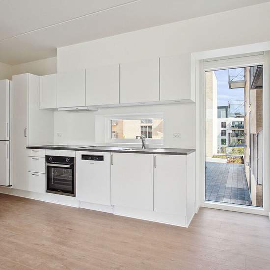 Du træder ind i et funktionelt køkken-alrum, som ligger i åben forbindelse med stuen, hvorfra der er direkte adgang til boligens altan. Der er ét eller to separate værelser afhængigt af boligens størrelse. Der er indbyggede skabe i soveværelserne. Du får et godt badeværelse med vaskefaciliteter, og der er gulvvarme i alle rum. Det er muligt at få en bolig i ét- eller to-plan. Boligerne er i udgangspunktet ens i deres udformning og kvadratmeter, med den forskel at lejlighederne i to-plan har ét stort vinduesparti fra gulv til loft i køkken-a...