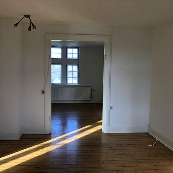 Nice, spacious, high‑ceilinged 3-room apartment of 95 sqm with hardwood floors: living room with a lovely view of the Langeland Bridge, dining room/extra room, bedroom, and a brand-new eat-in kitchen, toilet and bathroom. Private storage room in the basement.