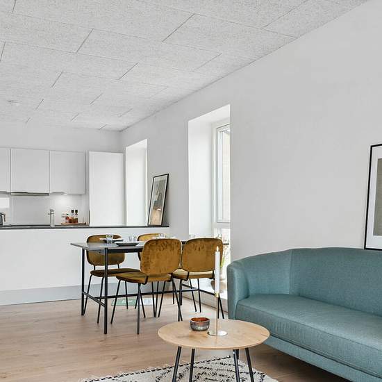 Lovely and inviting apartment, perfect for a couple, a small family, or as a shared flat between friends. The large open-plan kitchen/dining/living area is the heart of the home, with the kitchen, dining area and living room connected in an open layout. The kitchen is finished in light, modern materials and includes all major appliances as well as a lovely kitchen island where you can gather for cooking. From the living room there is direct access to the apartment’s terrace/balcony. The apartment’s two bedrooms are located at opposite ends o...