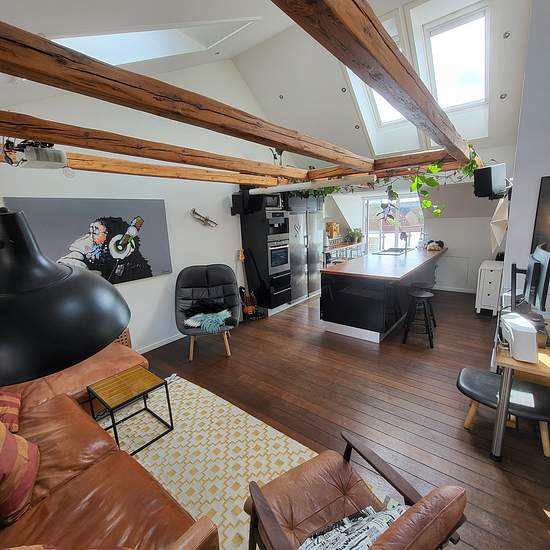 Exclusive bright penthouse with exposed beams and a cathedral ceiling, with a private south-facing terrace overlooking the roofs of the southern district. Large open and bright kitchen with access to the terrace. Skylights and underfloor heating throughout the apartment. Beautiful bathroom with a usable spa bath. In addition to the room and the bedroom, there is a mezzanine that has previously been used as an extra bedroom with a double bed. The mezzanine measures about 12 m2 in addition to the 110 m2. The apartment is close to the town...