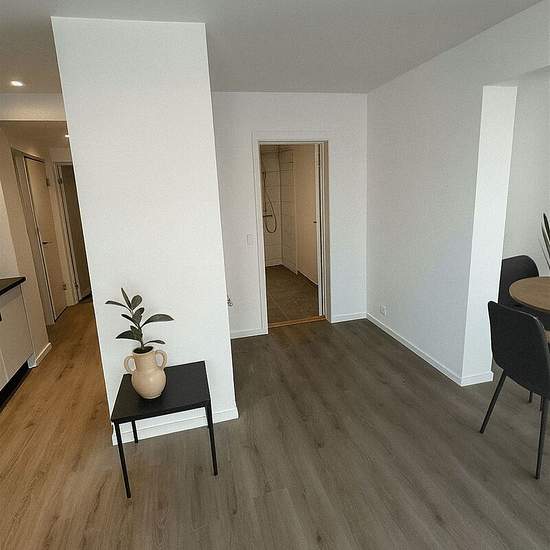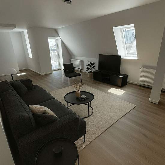 Welcome to this lovely and newly renovated penthouse apartment, perfectly located in the middle of Sønderborg’s cozy pedestrian street. Here you live right by the city’s pulse and at the same time enjoy a breathtaking view over the water. The apartment appears modern, bright and ready to move in. Layout: Entrance Large and inviting kitchen/dining area Bright living room with access to the large balcony Bedroom with built-in wardrobes Children’s room or office, also with built-in wardrobes Bathroom with its own washing machine and tumble drye...