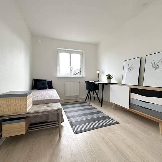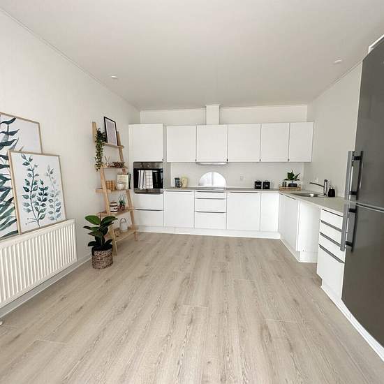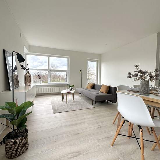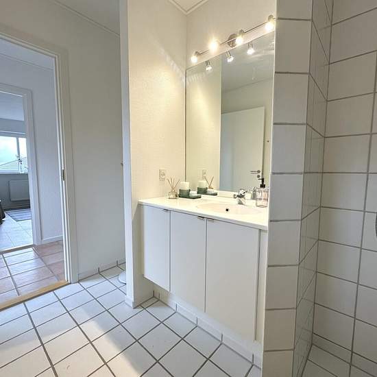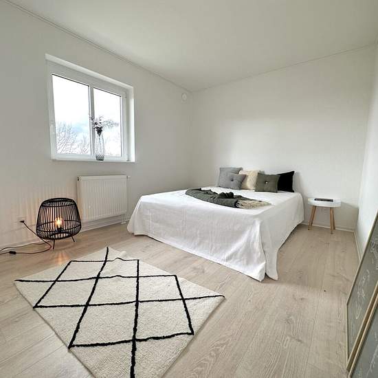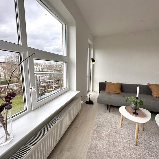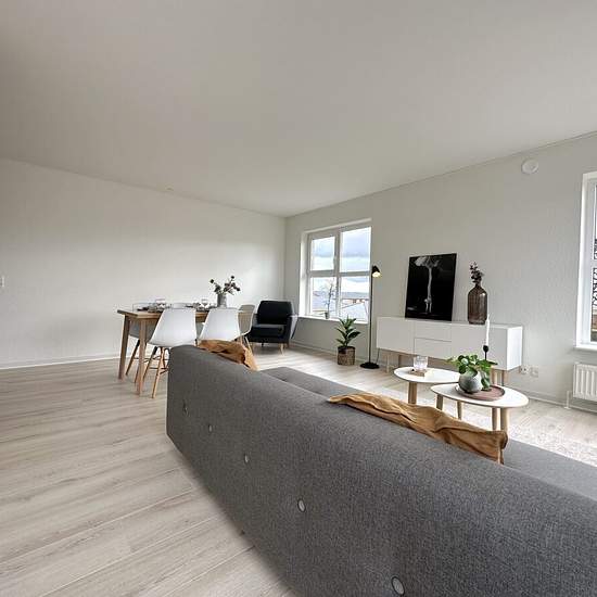 Lovely apartment in Tilst on a quiet, closed cul‑de‑sac. A lovely, private and peaceful area. The apartment has a lovely balcony where you can easily sit in privacy and enjoy cozy summer moments with the family. The apartment’s sweet spot is clearly the nice large kitchen and the spacious open living area. The large windows let in lots of light and there is direct access to the balcony. You get two good bedrooms with plenty of closet space. The bathroom is bright with a shower stall and room to install your own washer and dryer. There is...