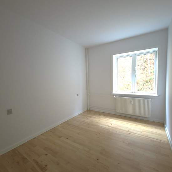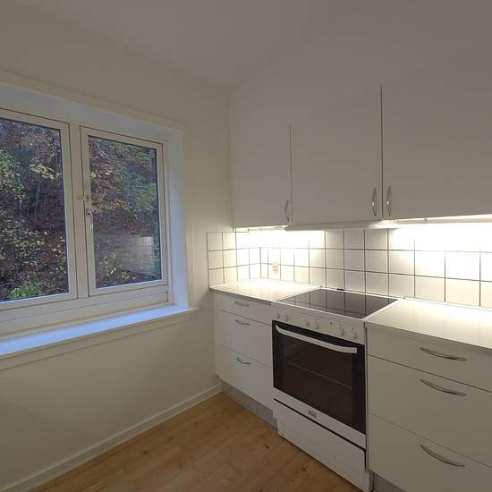 Renovated apartment with a fantastic view Beautifully completely renovated apartment with lacquered ash parquet floors throughout. Lovely bedroom with built-in wardrobes. Bright kitchen with white cabinetry and a dishwasher. Bathroom with underfloor heating and white cabinet units. Pets not allowed. The property, which was built in 1953 and has been continuously modernized, is located near the town center and offers a wide view over the Vejle river valley, the town of Vejle and the fjord. The building consists of 30 apartments. In the basem...