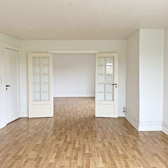 Spacious 3-room apartment located on Sjællandsgade, 9000 Aalborg. The apartment is situated in Aalborg’s Ø-gade district, a short distance from the green areas at Østre Anlæg, various shopping options and public transport. In addition, it is only a 5–10 minute bike ride to Aalborg’s vibrant café and city life in the city centre. The apartment is very bright and spacious with an entrance hall, two en-suite living rooms with French doors and the best view towards Østre Anlæg, a bedroom with a wall of built-in wardrobes, an attractive kitchen...