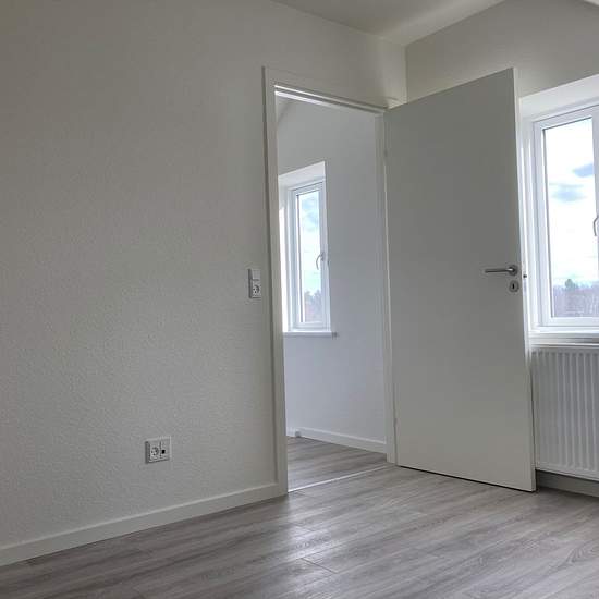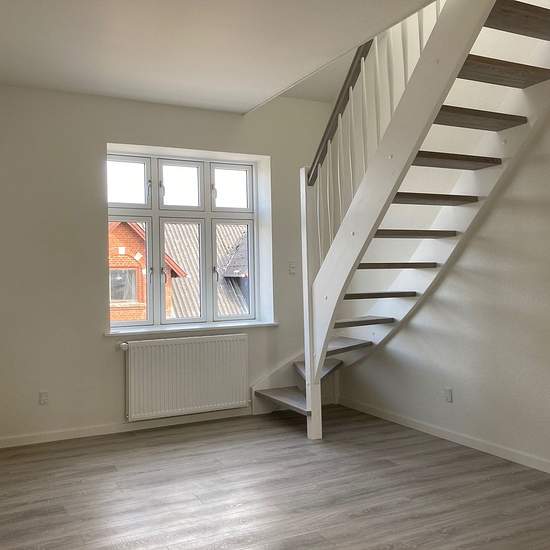 Description Bright 3-room apartment on 2 levels located centrally in Rødkærsbro. Close to shopping and public transport. The apartment comprises: living room, bedroom, kitchen, bathroom, a spacious landing with room for a sleeping area or a desk, and an additional room. Heating (advance payment): DKK 600/month Water (advance payment): DKK 300/month