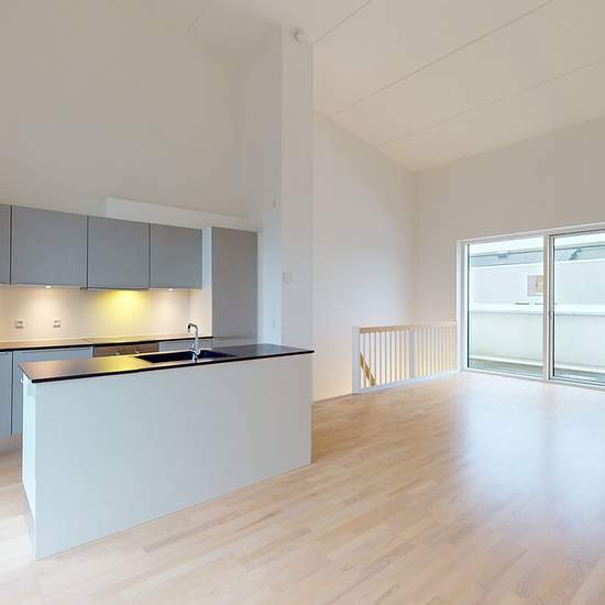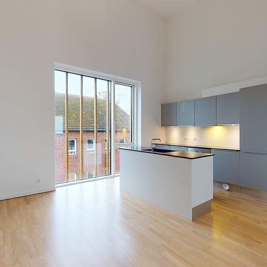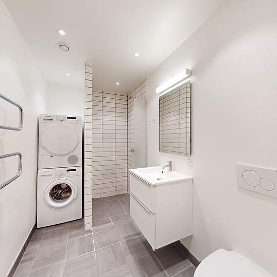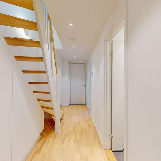 The residence is divided over two floors. The ground floor feels spacious and inviting and consists of two bedrooms and a bathroom. The rooms are a good size, offering a variety of furnishing and usage options. Each room is fitted with large, well-placed windows and/or French doors that provide excellent natural light. The bathroom is bright and roomy with white walls and white wall tiles in the shower, and a light gray stone floor that provides a nice contrast. The bathroom is equipped with a functional base cabinet with two drawers and a ...