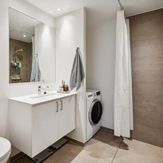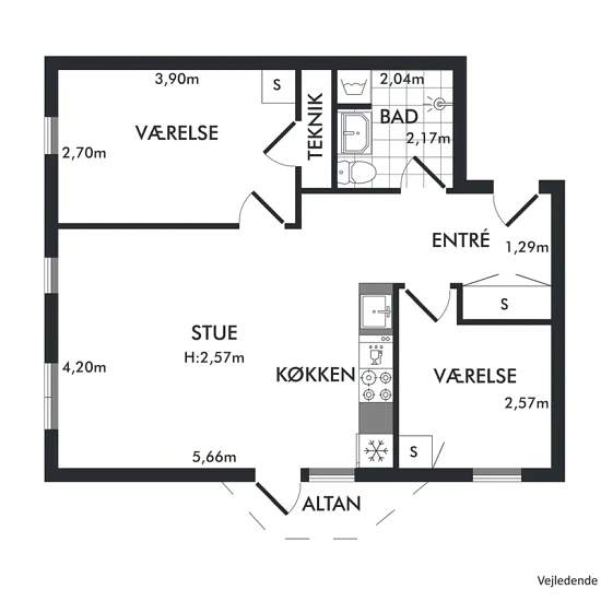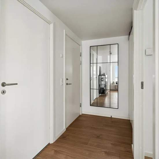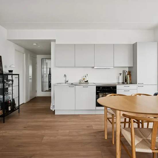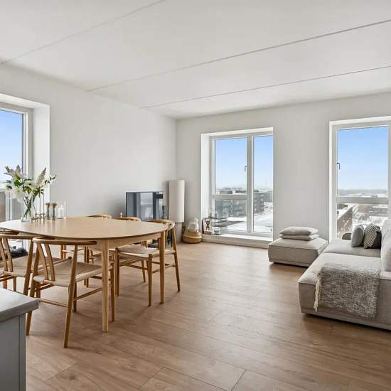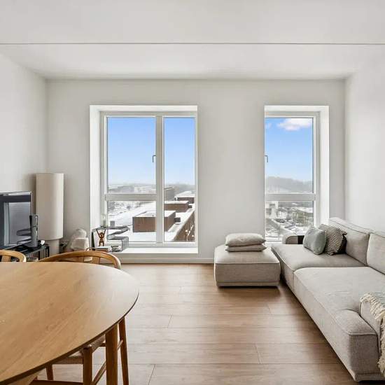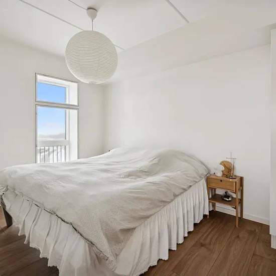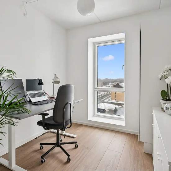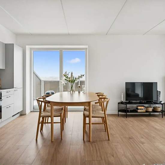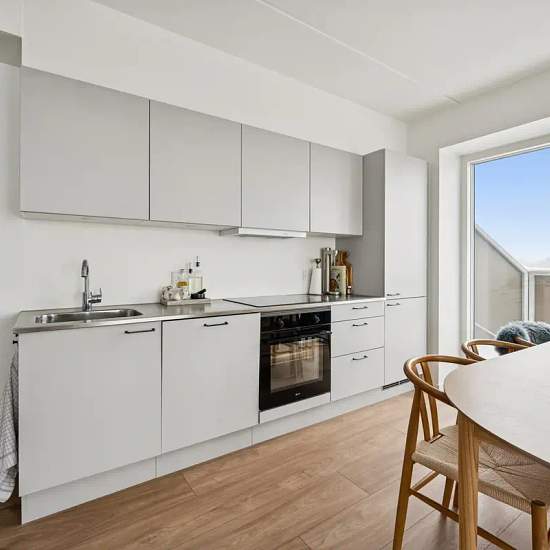The apartment has a very good layout with two regular rooms and a large living area with an open-plan kitchen. The living room feels spacious and has a lovely influx of light from the large window sections. There is plenty of space for both a dining table and a sofa arrangement, and from the living room there is direct access to the balcony, which offers a nice view over the area. The apartment contains two reasonably sized rooms, which can be used as a bedroom, children’s room, office or guest room — depending on needs. The bathroom is b...