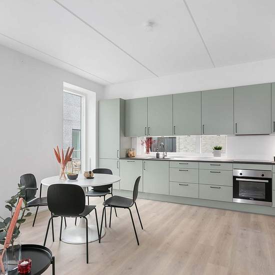 Description This inviting 3-room terraced house with Designa+ interior comprises 80 well-utilized square metres spread over two levels. From the entrance hall, which includes a toilet, you walk directly into the open kitchen-living area, where there is room for the family in the sleek JKE kitchen with appliances from Siemens. The living room has a glass door straight out to the garden, which provides a lovely influx of light and creates a natural transition to the garden and the sunny terrace. Under the stairs to the first floor there is ...