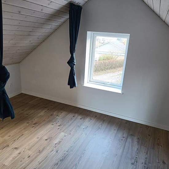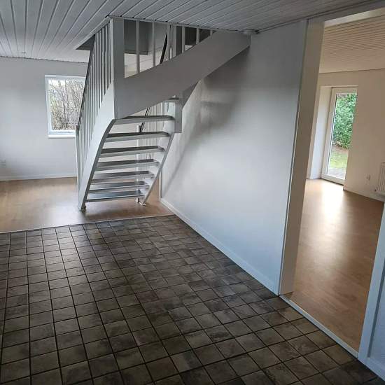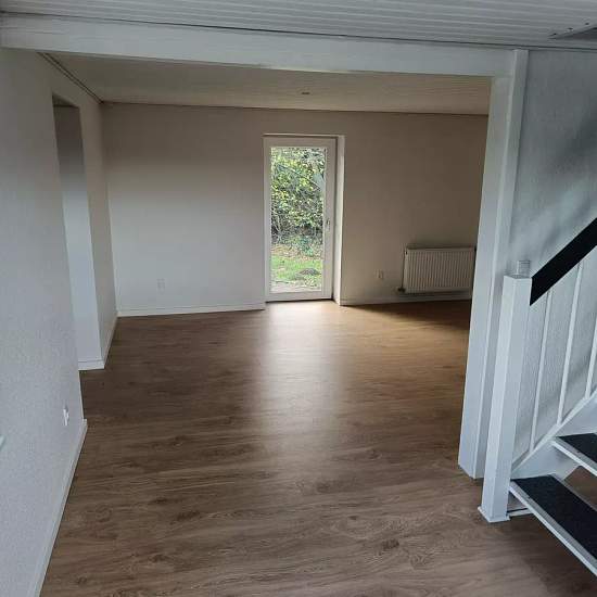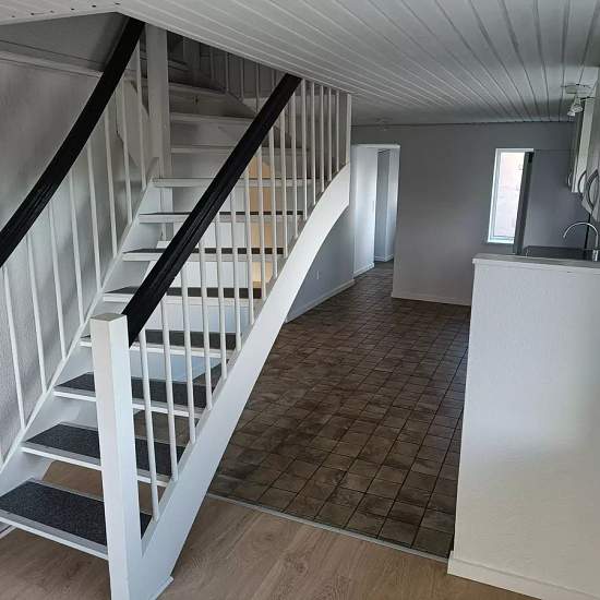 Lovely small villa on a quiet residential street overlooking a scenic natural area, with a large sloping garden and a separately situated carport. The house comprises an entrance hall leading to a living room with an open-plan connection to the kitchen. There is a bathroom and a bedroom/dining room on the ground floor. On the first floor are two rooms accessed via the stairs from the living room/kitchen. There are two small outbuildings suitable for bicycles and garden tools. Available now.