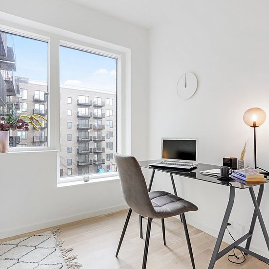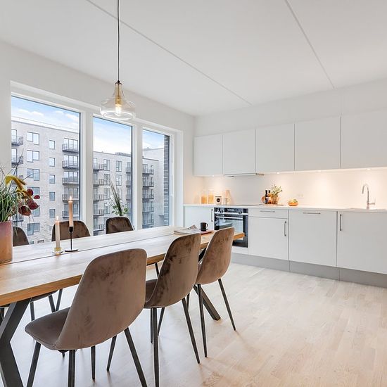 Don't want to compromise on city life and a central location? Then you should live in one of Primula Hus' 190 apartments, where you are surrounded by beautiful green oases, a blossoming community, and the city's many opportunities just around the corner. This 4-room apartment offers a kitchen, large living room, and 3 good bedrooms. Additionally, the home features a bathroom with a washing machine and dryer. The home also has a nice balcony. Primula Hus consists of 190 residences ranging from 2 to 4 rooms. All apartments have lovely terraces...