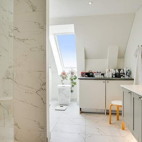 Welcome to a bright and spacious 145 m2 apartment with a practical everyday layout and a lovely view of the Limfjord. The home is located right by Friis, so you live in the heart of the city's conveniences with shopping, dining and the harbor front just outside the door – at the same time you get modern comforts with an elevator in the building, parking at the property and an electric car charging station. The apartment offers a large, open living area where the living room and kitchen blend together. The continuous light floors, large wind...