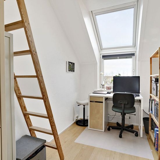 The ground floor offers an open kitchen-living area with all major appliances, including a fridge-freezer, oven, hob, and dishwasher. The bathroom has underfloor heating and its own washer-dryer. On the first floor, you will find three good-sized rooms, two of which have lofts. There is access to a private balcony from the kitchen-living area. Additionally, the property has its own storage room. It is allowed to have a dog or cat by agreement.