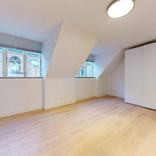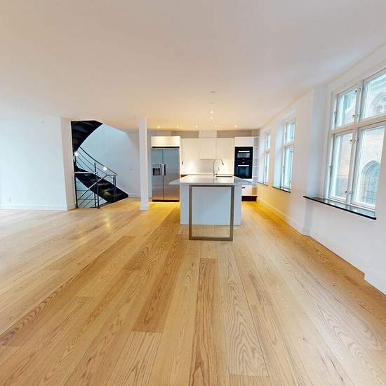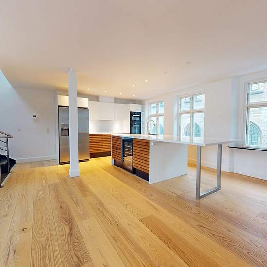 About the Property Landemærket | 3 bedrooms | 1 bathroom | Unfurnished | Roof terrace | 2 balconies Exceptional apartment with roof terrace and view of the Round Tower in the heart of central Copenhagen Welcome to this exceptional apartment on Landemærket. The apartment spans 175 square meters. There are 3 bedrooms, one bathroom and a guest toilet, as well as a large open-plan kitchen and living area. In addition, the apartment includes a large roof terrace and 2 balconies. When you step into the entrance hall, you are taken up the stairs ...