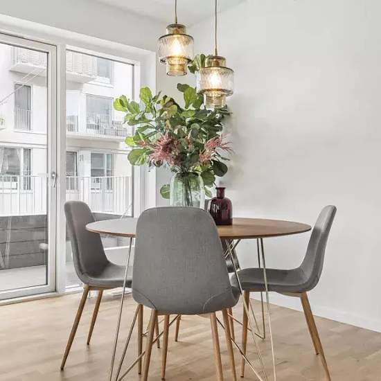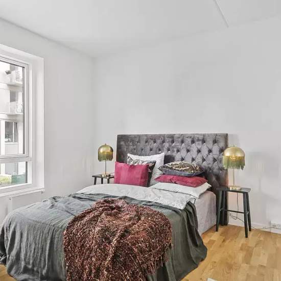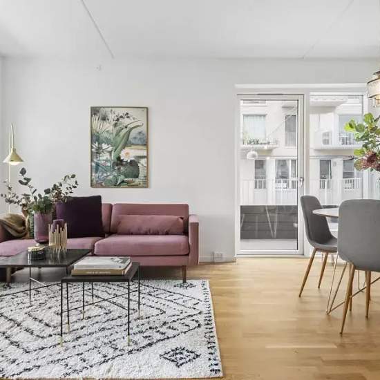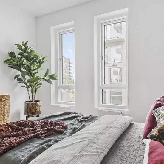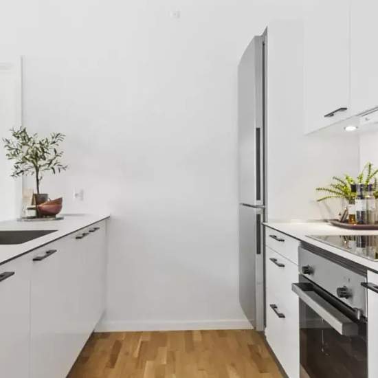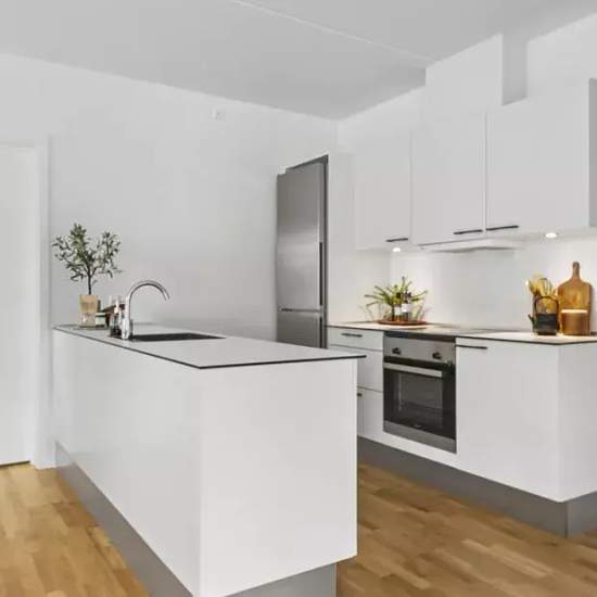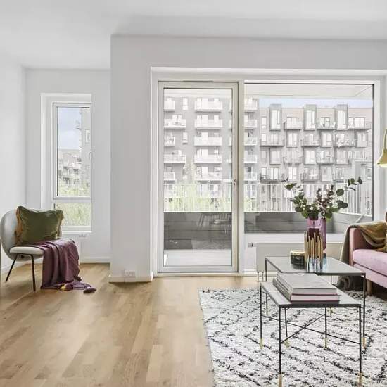 The apartment The apartment is laid out with a large open-plan living area where the kitchen and living room merge to create a spacious atmosphere. The large windows draw light into the apartment from every angle. In addition, the home is equipped with a modern kitchen from Invita, appliances from Bosch Siemens, as well as practical closet space in the master bedroom. From the hallway you have access to the spacious and inviting bathroom with underfloor heating, a molded marble sink, a wall-hung toilet and a washer-dryer stack. From the livi...
